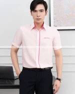 Với tông màu chủ đạo là hồng phớt nhẹ nhàng, cùng dòng logo được thêu gọn gàng bằng chỉ hồng cánh sen bên phía ngực trái áo, nhấn nhá bằng đường viền cùng tông logo ở phần trong cổ áo và dọc hàng cúc áo, chiếc áo đồng phục sơ mi Aeon Mall thể hiện hình ảnh thương hiệu AEON thân thiện, hiếu khách và dễ chịu trong mắt khách hàng.